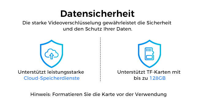 Durch fortschrittliche PIR-Sensoren PIR-Sensoren kann die Überwachungskamera Außenbereich menschliche Bewegungen erkennen, in Echtzeit Alarmbenachrichtigungen an das Mobiltelefon senden und Sirenenalarme aktivieren, um unerwünschte Besucher abzuschrecken. Ereignisse werden entweder auf einer Mini-TF-Karte mit bis zu 128 GB (nicht enthalten) aufgezeichnet oder verschlüsselt und sicher in der Cloud gespeichert.